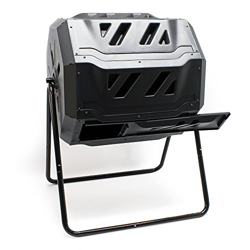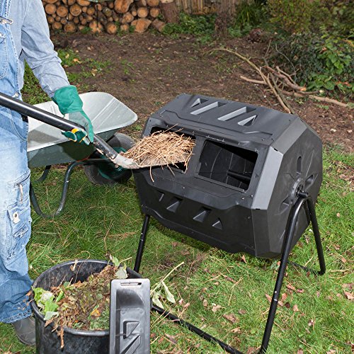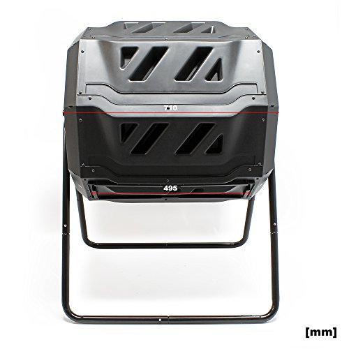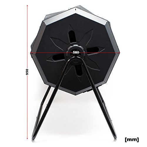 De kunststof container heeft een inhoud van 160 liter en wordt gedragen door een zwart gecoat buisframe. Daarmee is de composttrommel vrij zwevend en kan hij moeiteloos worden gedraaid. Het roteren mengt de compost gelijkmatig en voorziet deze van voldoende zuurstof. Regelmatig roteren verkort de verrottingstijd. Draai de trommel het liefst na elke keer vullen 5 tot 10 keer of 2 tot 3 keer per dag.